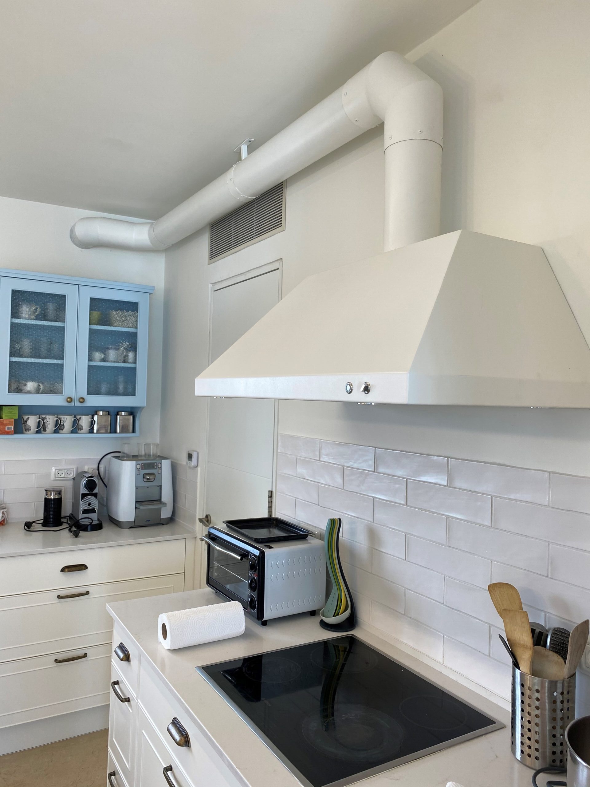 קולט אדים לבן משופע עם ארובה ומפוח חיצוני יצור והתקנה
